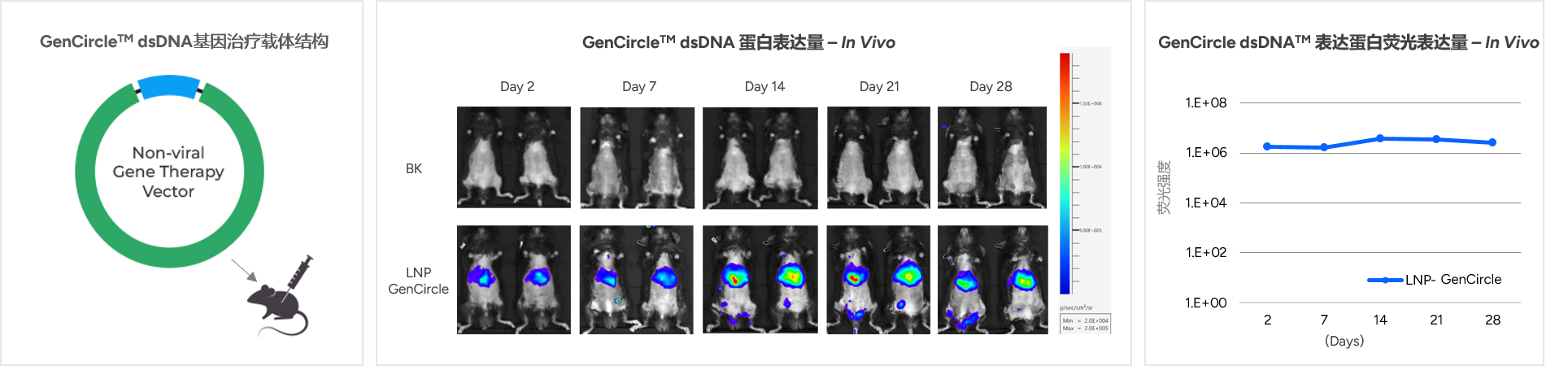 采用LNP递送表达luciferase的GenCircle™ dsDNA(GenCircle-CMV-Luc2),DNA剂量为1MPK/test,单次小鼠尾静脉注射后,活体成像仪检测luciferase表达
