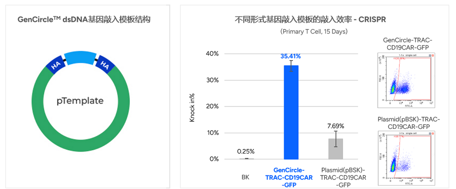 GenCircle™ dsDNA的基因敲入效率可达到普通质粒的4倍,高达35.41%
