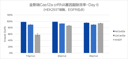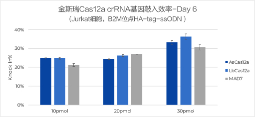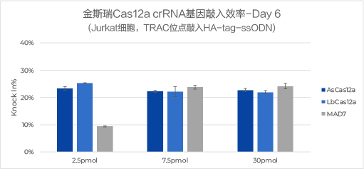 实验结果: 使用金斯瑞Cas12a crRNA,针对不同酶均可以获得较高的基因敲入效率: