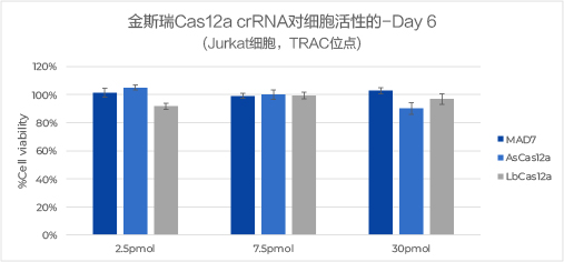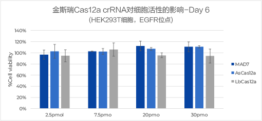 实验结果: 金斯瑞Cas12a crRNA不影响HEK293细胞和Jurkat细胞的细胞活性,不会干扰后续基因编辑实验。