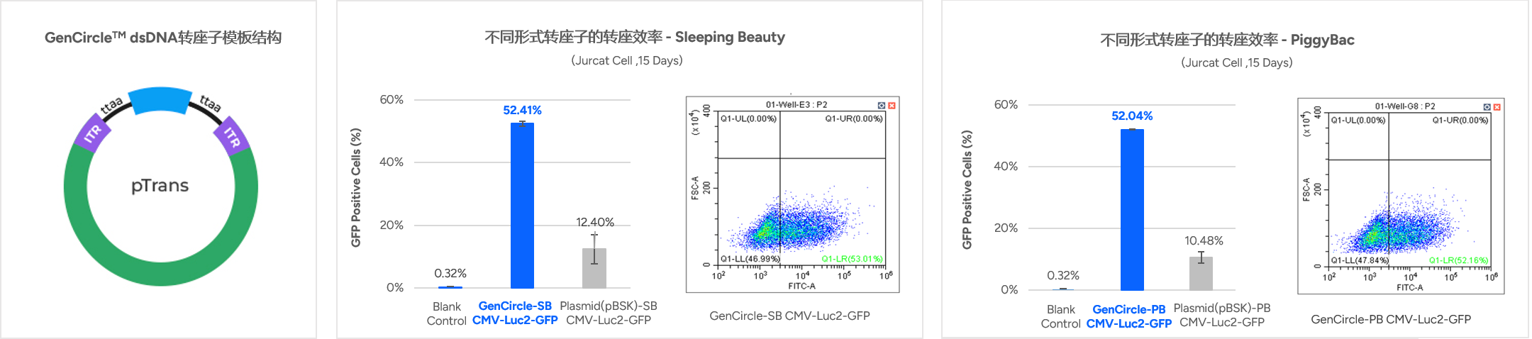 - PiggyBac体系:较之普通质粒,GenCircle™ dsDNA制备转座子的方案下,转座效率提升至5倍,高达52.04%