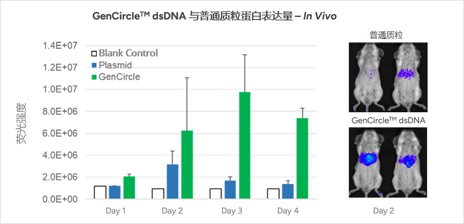 采用LNP递送表达luciferase的GenCircle™ dsDNA(GenCircle-CMV-Luc2),DNA剂量为1MPK/test,单次小鼠尾静脉注射后,活体成像仪检测luciferase表达
