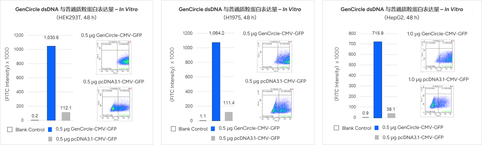 在HEK293T,H1975,HepG2细胞中,GenCircle™ dsDNA的蛋白表达量均显著高于普通质粒,表达量可高达18倍