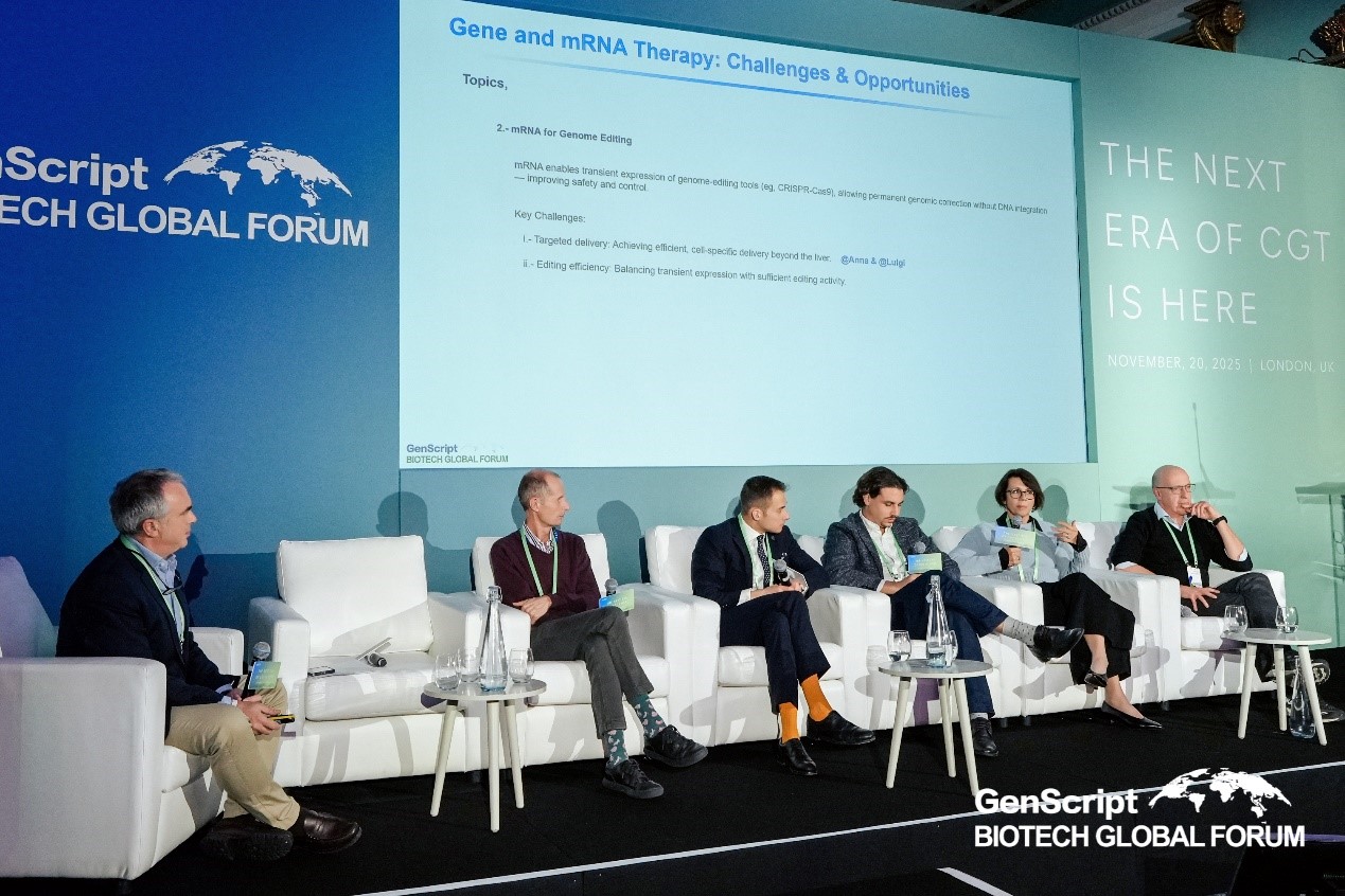 在“基因治疗与mRNA疗法”圆桌讨论中,Syngoi Technologies首席科学官Julen Oyarzabal博士担任主持人,与赛诺菲RNA科学自动化部门负责人Sergio Linares Fernández博士、欧盟委员会联合研究中心科学官Luigi Calzolai博士、意大利特伦托大学先进基因编辑技术实验室负责人Anna Cereseto博士、伦敦帝国理工学院黏膜感染与免疫学讲席教授Robin Shattock博士、Sensible Biotechnologies首席执行官兼联合创始人Miroslav Gasparek展开深入讨论。