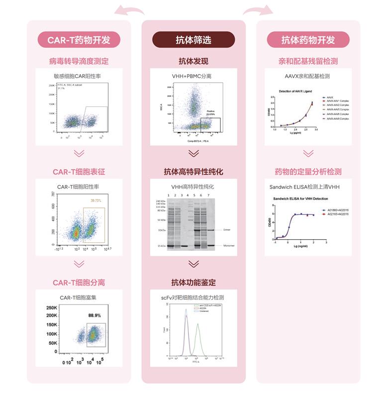 为支持scFv和VHH药物领域的研究,金斯瑞率先提出了scFv及VHH研究整体解决方案。我们提供了一整套scFv及VHH研究工具试剂,涵盖了scFv及VHH研究的各个环节,包括抗体发现、纯化、功能鉴定、慢病毒转导滴度测定、CAR-T细胞表征与分离以及亲和配基残留检测和药代动力学检测等,旨在为研究人员提供全面的支持,助力您在scFv及VHH研究中取得成功。