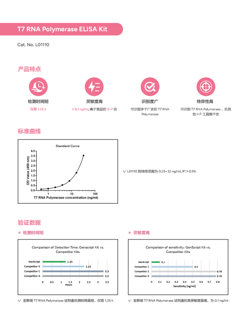 金斯瑞推出的T7 RNA Polymerase ELISA Kit灵敏度高至0.1 ng/ml,操作简便,仅需1.25 小时、特异性高,抗其它IVT酶的干扰,可高效检测工艺及成品中的酶残留,为mRNA生产提供可靠质量保障。